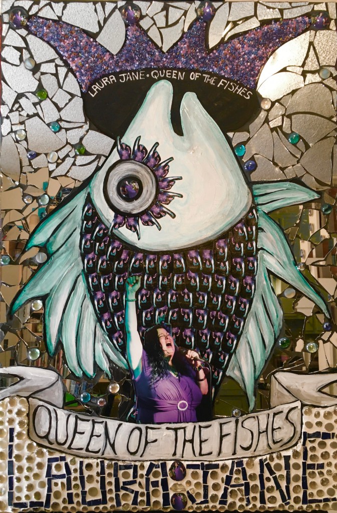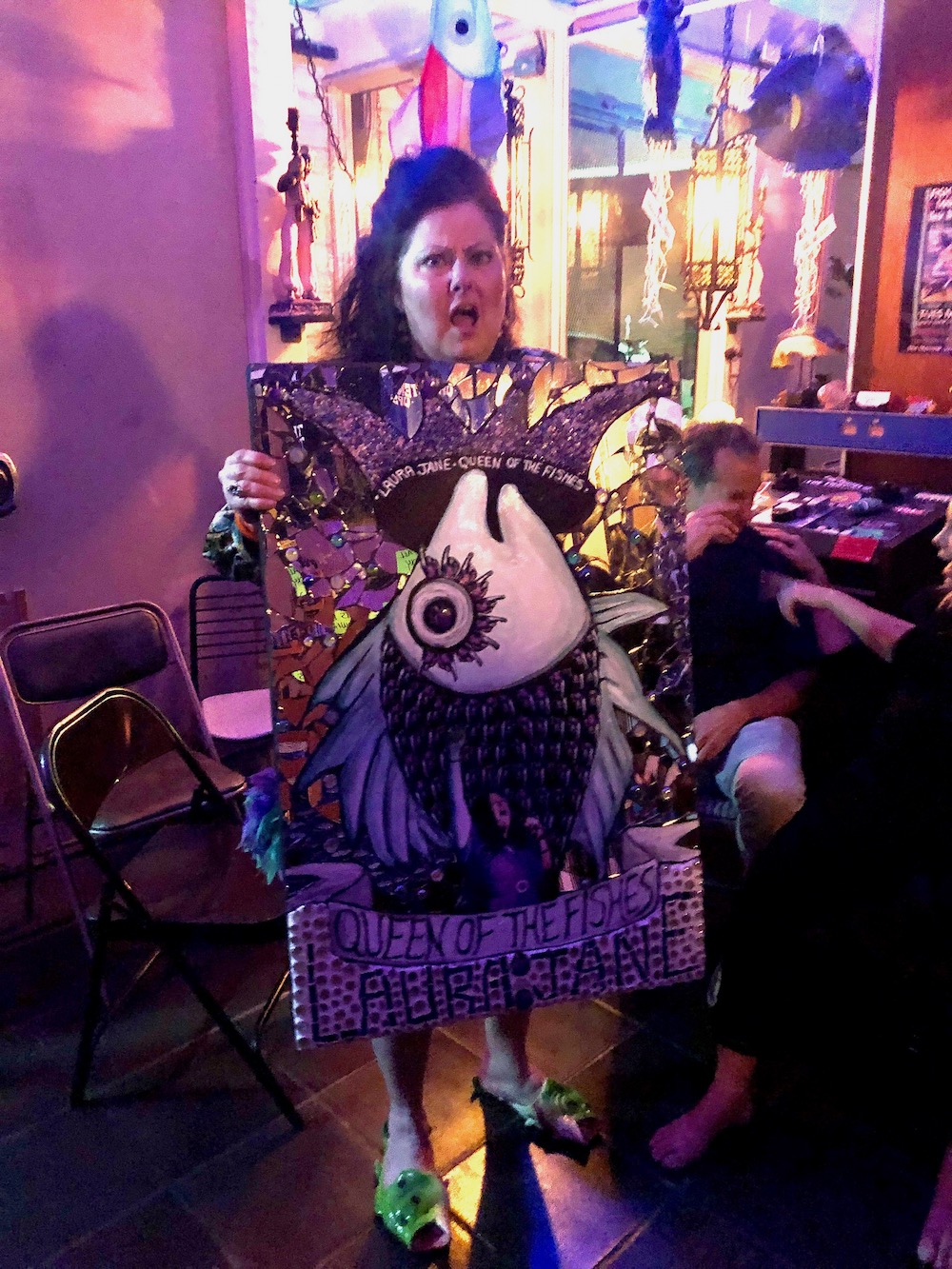 I created this for my dear friend and fish muse – the unflappable Laura Jane Willcock. She has annually hosted a Fish Party to celebrate her birthday along with all Pisces for the last 38 years. Really, it is more of an event, rather than a mere party, with several bands playing, dancing, and fun, but this year it will be a quieter affair— however, the Fish Party must go on! Laura Jane is an amazingly talented entertainer, a really wonderful person with a heart of gold, a fantastic friend, and a True Fish! Happy Birthday Laura Jane! Photo Credit Robert Rossi (LJ in Purple Dress)