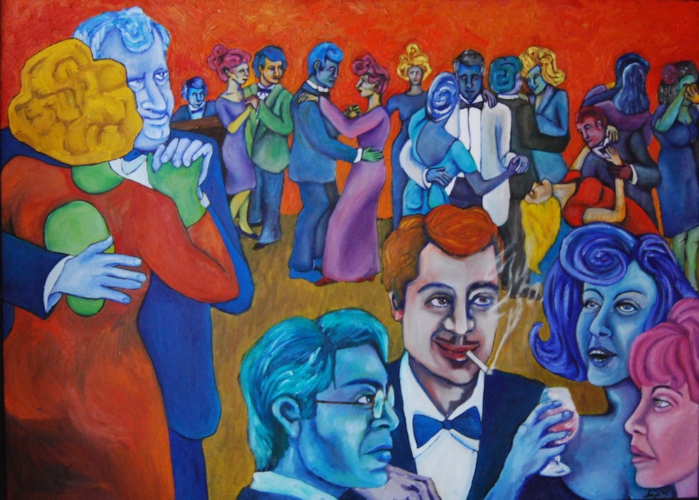 Here is an Oldie, but still a Goodie! I created this painting in CELEBRATION of my sister’s wedding 28 years ago! It was a 4 day extravaganza and a super special funning- it event! I used to paint only the things that made me happy- friends, family, parties, babies, dogs- because I reasoned that there were enough images of pain and ugliness in the world that I didn’t need to add to all that unhappiness…. Now I may, occasionally, make a painting or series with a “unhappy” or critical intent, but my paintings always contain humor and a “f**k IT all” attitude, because you have to laugh, otherwise you will cry and cry! Anyways, I hope to be celebrating life with friends and family and just random people again! Let’s get this Pandemic in hand already! Life is a book and everyday is a new page, so just keep reading! 🙂